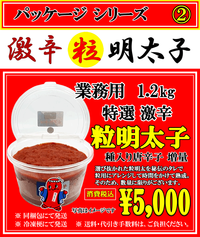激辛 粒 明太子 販売価格 5,000円 消費税込 内 容 量:1200g ※ 冷凍便にて発送。 ※ 送料・代引き手数料は、ご負担ください。